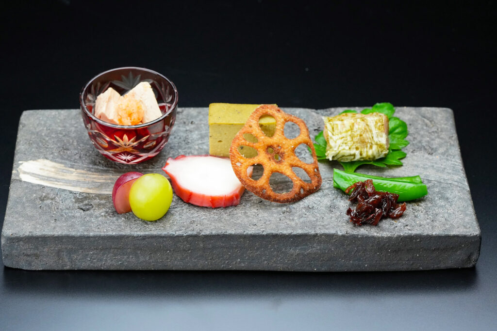 【前菜】甘海老昆布まき・あん肝紅葉おろし・牡蠣真薯・タコ旨煮・蓮根せんべい・スナックエンドウ干し貝柱佃煮・葡萄