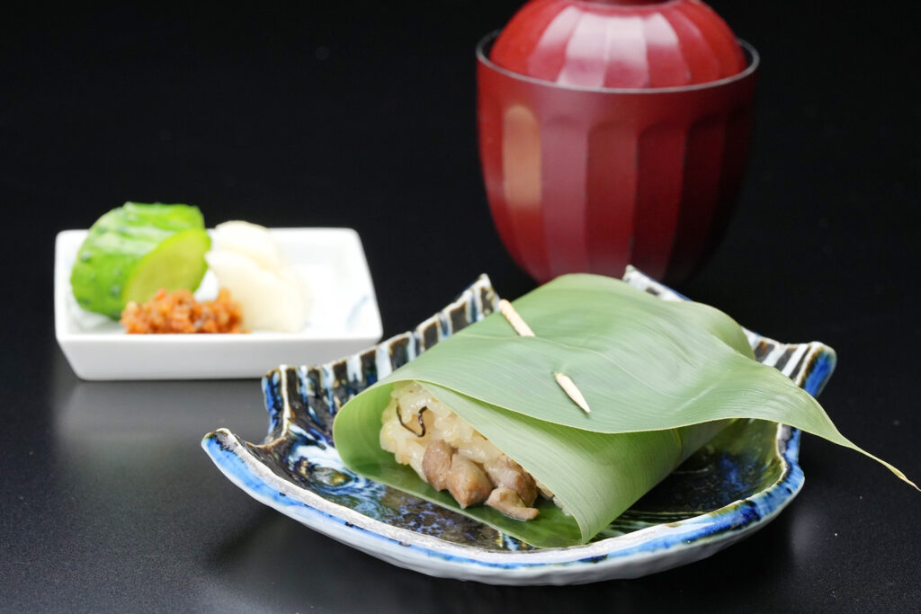 【食事】いわい鶏おこわ蒸し・三陸産若芽味噌汁・お新香